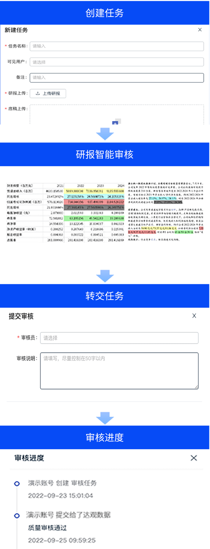 研报审核流程管理,变革券商研究所业务新模式工作方式 系统支持不同角色用户对文档在线协同操作,并对研报审核业务进行全流程线上管理,便于用户对历史任务进行监管、留痕、查看。